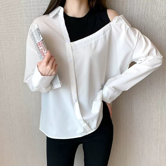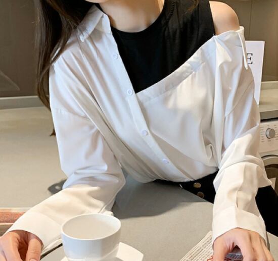 長袖シャツ レディース トップス フェイクツーピース 重ね着風 春夏 オフショルダー おしゃれ カジュアル お出かけ 個性的 シンプル 無地 ゆったり ルーズ ブラウス タンクトップ 薄手 白シャツ