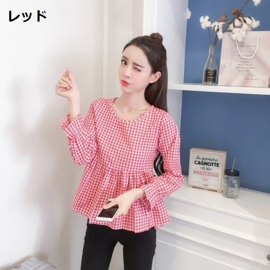 長袖ブラウス レディース トップス シャツ チェック柄 格子柄 カジュアル お出かけ おしゃれ コットン 綿 プルオーバー ラウンドネック 長袖 カットソー ペプラム 春夏 切り替え 長袖ブラウス