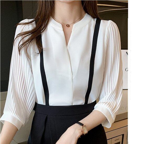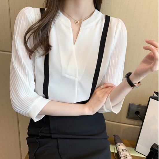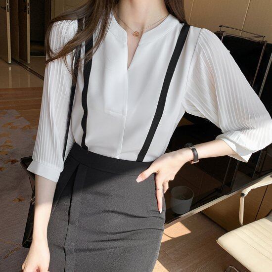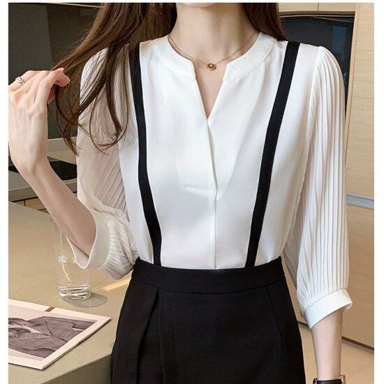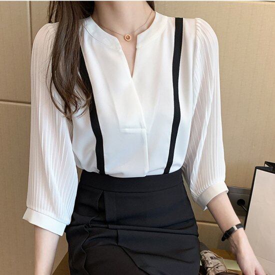 ブラウス キーネック プリーツスリーブ モノトーン Vネック シャツ プルオーバー 七分袖 五分袖 スキッパー レディース シック モード きれいめ 上品 おしゃれ オフィス 通勤 シャツ