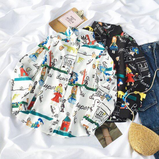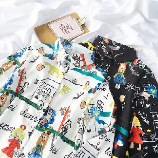 プリントシャツ レディース ブラウス トップス 襟あり ポロ襟 長袖シャツ フロントボタン カジュアル お出かけ おしゃれ 個性的 黒 白 ブラック ホワイト プリント 総柄 長袖ブラウス 女性