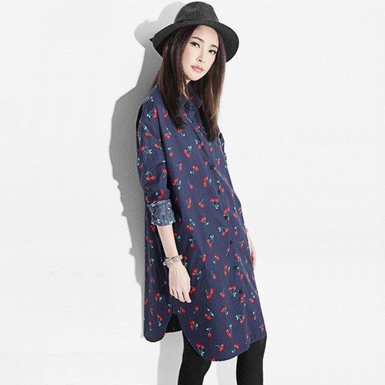 ロングシャツ レディース 長袖シャツ プリント チェリー さくらんぼ柄 総柄 チュニック カジュアル お出かけ おしゃれ 可愛い フロントボタン ラウンドヘム ゆったり ミドル丈 長袖 女性