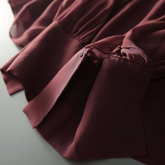 すっきりとしたVネックと肩からのドレープがエレガントな雰囲気に♪