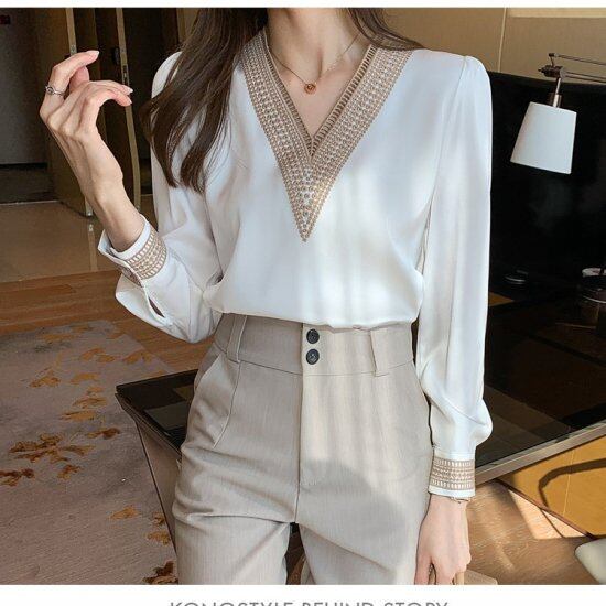 ブラウス Vネック Vネックプルオーバー バイカラー 長袖 ブラウス シャツ レディース シルクタッチ 白 ホワイト エスニック レトロ クラシカル きれいめ 上品 オフィスコーデ おしゃれ
