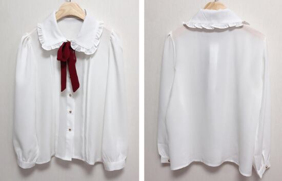長袖ブラウス レディース シャツ トップス フリル襟 リボン 襟あり フロントボタン 金ボタン ピンク ホワイト カジュアル お出かけ おしゃれ きれいめ 長袖シャツ シフォンシャツ 女性 トップス