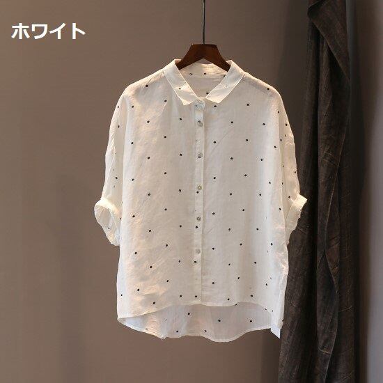 リネンシャツ レディース トップス 半袖シャツ 襟あり ポロ襟 フロントボタン ドット柄 水玉 白 黒 ホワイト ブラック ゆったり リネン カジュアル お出かけ おしゃれ 春夏 薄手 ブラウス 女性