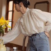 ブラウス フリル スタンドカラー ランタンスリーブ レディース シャツ ボリューム袖 バルーンスリーブ ギャザー ブラウス レトロ クラシカル 白 ホワイト かわいい 上品 清楚 ガーリー おしゃれ