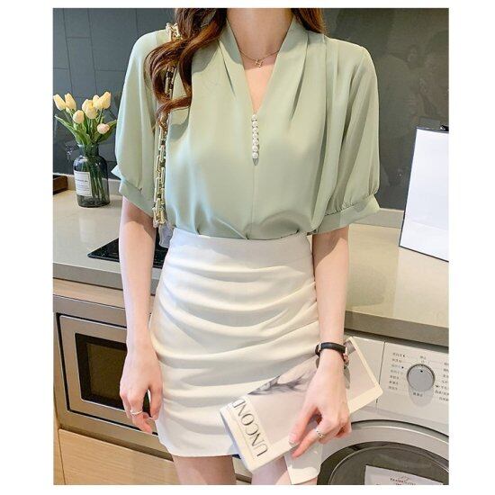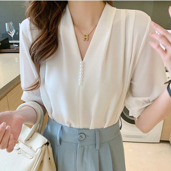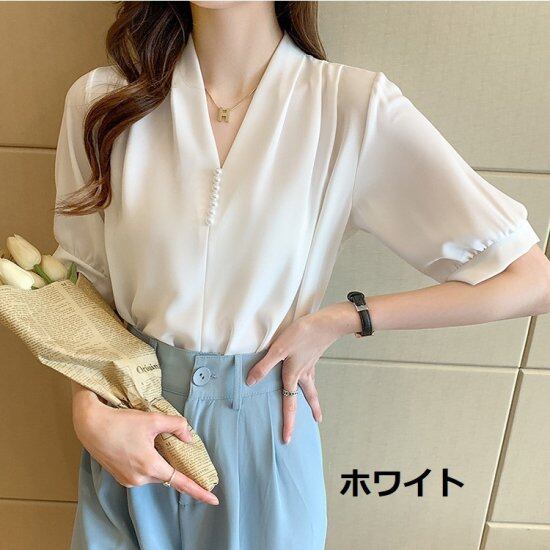 ブラウス Vネック パール付き 半袖ブラウス レディース シャツ シフォンブラウス パフスリーブ ドレープ 白 ホワイト グリーン きれいめ 上品 エレガント セレモニー オフィス おしゃれ 春夏
