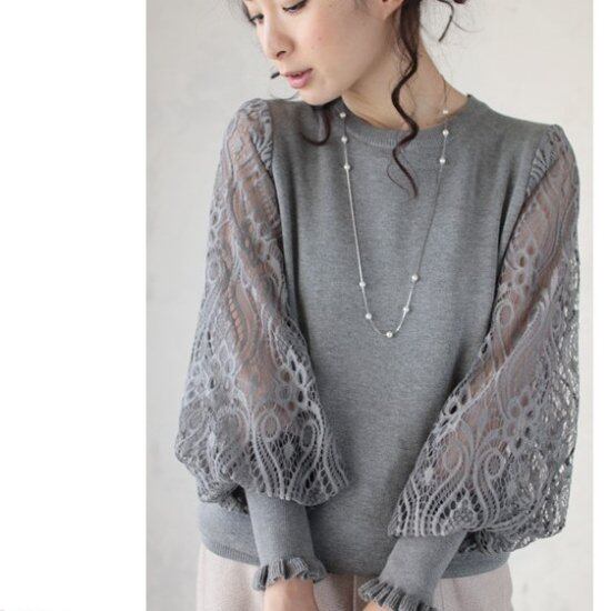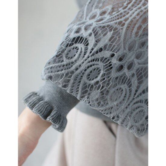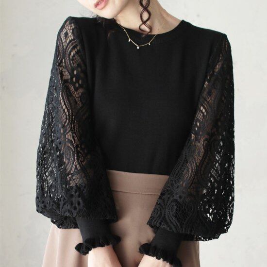 ニットセーター レーススリーブ ニット ボリューム袖 レディース セーター ニットプルオーバー 透かしレース 黒 ブラック ホワイト かわいい きれいめ 上品 エレガント お呼ばれ おしゃれ