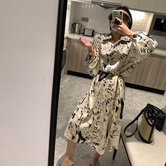 柄ワンピース シャツワンピース 英字ロゴ ロングワンピ シャツワンピ ゆったり 大人カジュアル 大きめサイズ 春ワンピ レディース 長袖 英字柄 おしゃれ 柄ワンピース シャツワンピース 英字ロゴ