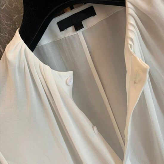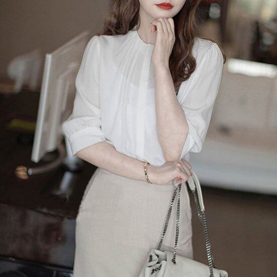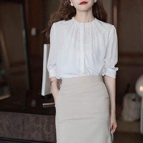 ブラウス ノーカラーブラウス プリーツ レディース シャツ ギャザー クルーネック 五分袖 半袖 白 ホワイト レトロ クラシカル 上品 きれいめ 清楚 おしゃれ オフィスコーデ 通勤 春 夏