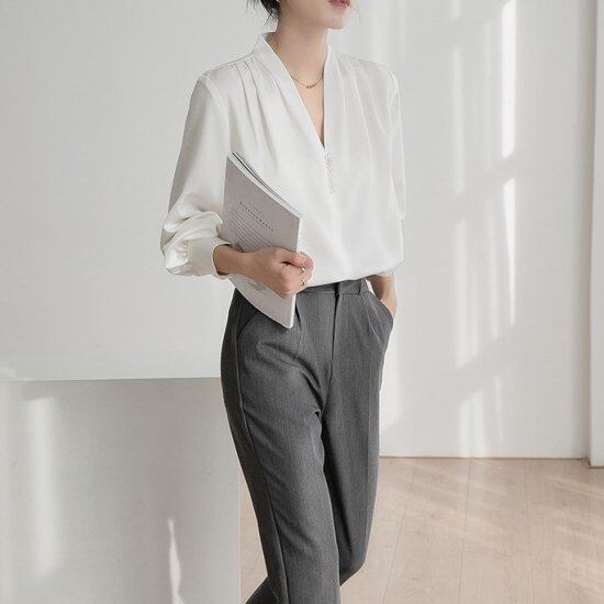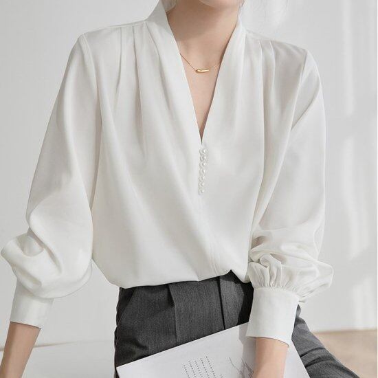 ブラウス Vネックブラウス パール付き レディース シャツ ノーカラーブラウス ボリューム袖 ランタンスリーブ 白 ホワイト ブルー きれいめ 上品 おしゃれ オフィス 卒入園 卒入学 セレモニー