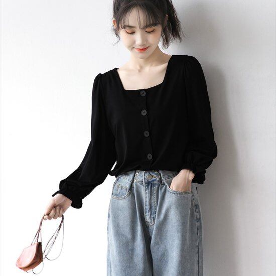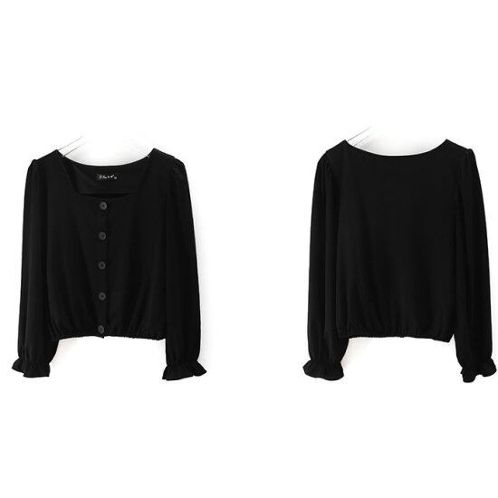 ブラウス 長袖ブラウス スクエアネック レディース シャツ パフスリーブ 長袖シャツ 無地 シンプル クロップド丈 ショート丈 黒 ブラック レトロ クラシカル かわいい きれいめ おしゃれ