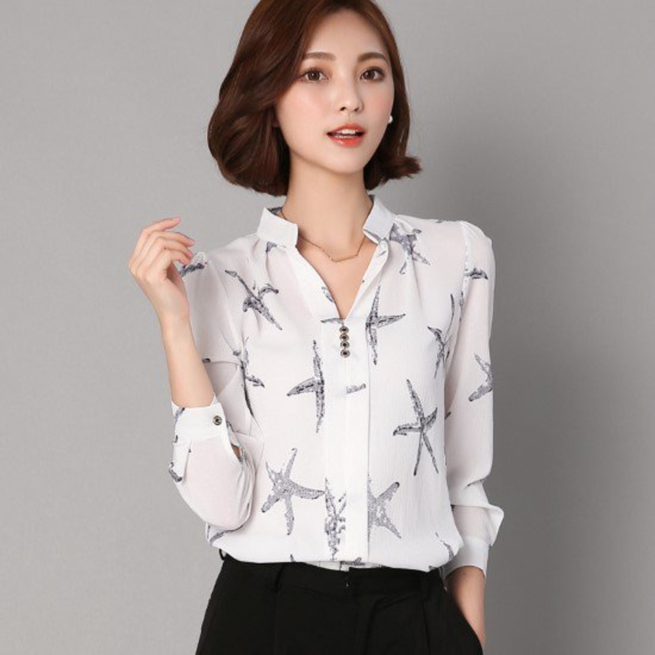 長袖シャツ レディース トップス ブラウス シャツ ヒトデ柄 プリント 総柄 シフォンブラウス Vネック プルオーバー 春夏 カジュアル お出かけ おしゃれ 白 黒 ホワイト ブラック シフォンシャツ