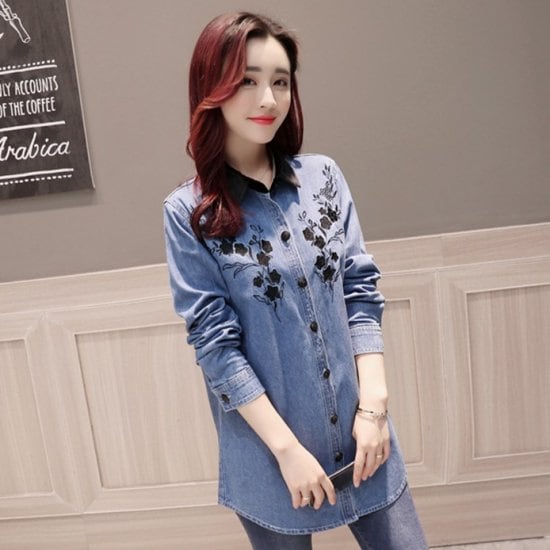 フラワー刺繍を施したデニムシャツブラウス。