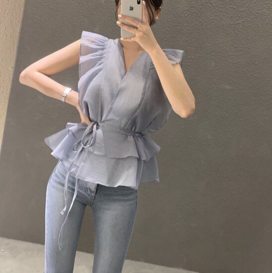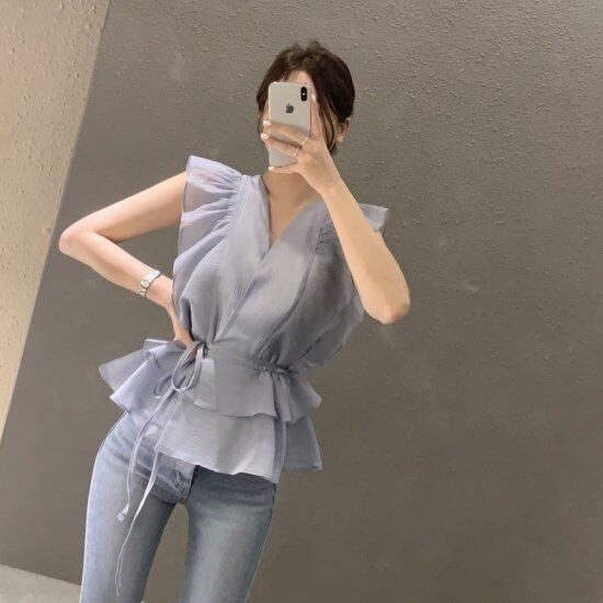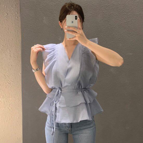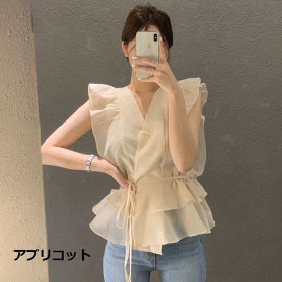 ブラウス フリルブラウス ノースリーブブラウス レディース シャツ Vネック カシュクール ウエストリボン ティアード ホワイト ブルー かわいい きれいめ エレガント 透け感 シアー 春夏