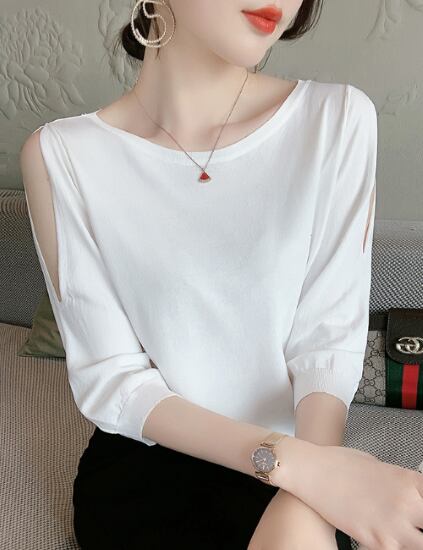トレンド感たっぷりな肩見せデザインの七分袖カットソー。