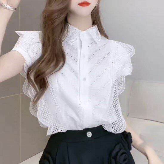 レースブラウス レディース トップス シャツ ブラウス レース シースルー 襟あり ポロ襟 フレンチスリーブ フロントボタン 春夏 ホワイト 白 フリル カジュアル お出かけ おしゃれ きれいめ 女性