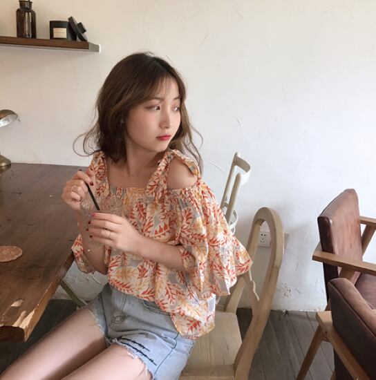 プリントブラウス レディース ブラウス トップス シャツ 肩見せ ストラップ 総柄 フリル袖 カジュアル お出かけ おしゃれ 可愛い 春夏 ゆったり ルーズ オレンジ 半袖 デコルテ ファッション