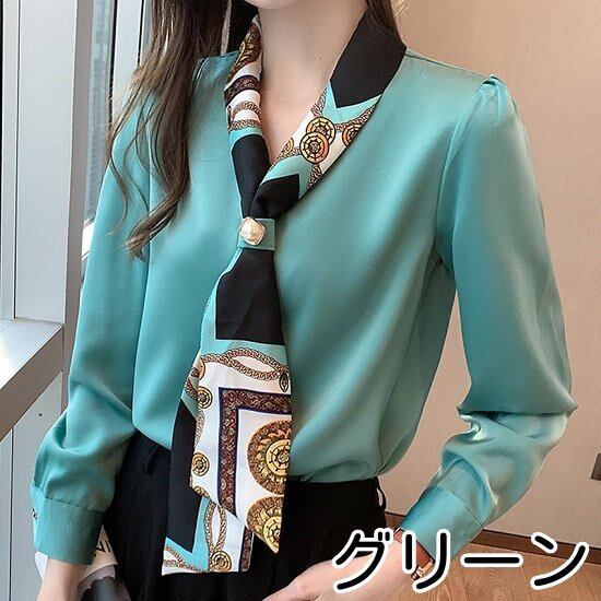 ブラウス レディース 長袖 ボウタイ 大きいサイズ スカーフ柄 シャツ Vネック 春夏 春 夏 オフィス 通勤 お呼ばれ ボウタイブラウス フォーマル シャツブラウス トップス きれいめ パールボタン