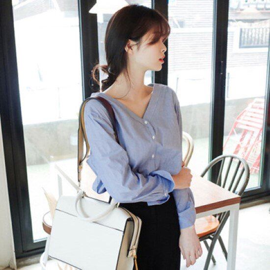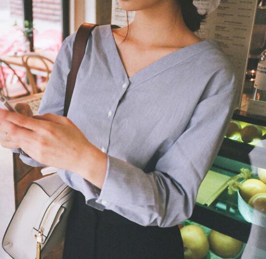 ストライプシャツ レディース トップス ブラウス ストライプ Vネック 長袖 フロントボタン カジュアル お出かけ おしゃれ きれいめ オフィス OL 春夏 デコルテ シンプル ベーシック 定番 女性