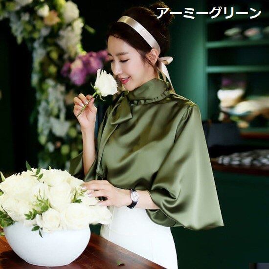 長袖シャツ レディース ブラウス トップス ボリューム袖 ランタンスリーブ スタンドカラー 襟元リボン 無地 カジュアル お出かけ おしゃれ きれいめ エレガント フォーマル 袖ボタン ぽわん袖