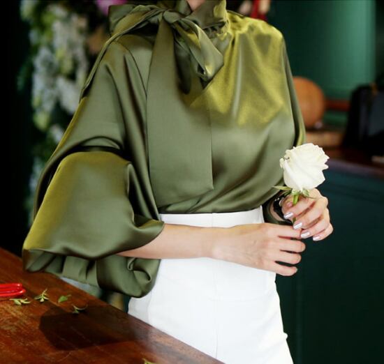 ボウタイリボンと印象的な大きなバルーンスリーブがドレッシーなフェミニンブラウス。