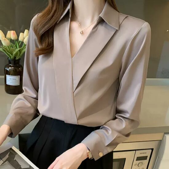 シフォンブラウス レディース シャツ トップス Vネック シンプル 無地 襟あり 長袖 カジュアル お出かけ おしゃれ きれいめ オフィス 通勤 袖口ボタン プルオーバー ファッション 女性 ブラウス