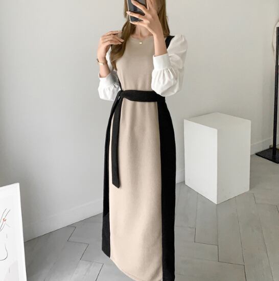 ニットワンピース レディース 膝下ワンピース フェイクツーピース 重ね着風 ラウンドネック 長袖 ウエストベルト パフスリーブ ボリューム袖 カジュアル お出かけ おしゃれ きれいめ オフィス 女性