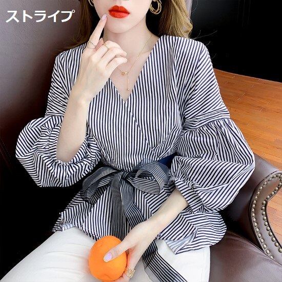 シフォンブラウス レディース シャツ トップス Vネック ウエストリボン カシュクール クロスデザイン シンプル 無地 ストライプ ボリューム袖 カジュアル お出かけ おしゃれ きれいめ ファッション