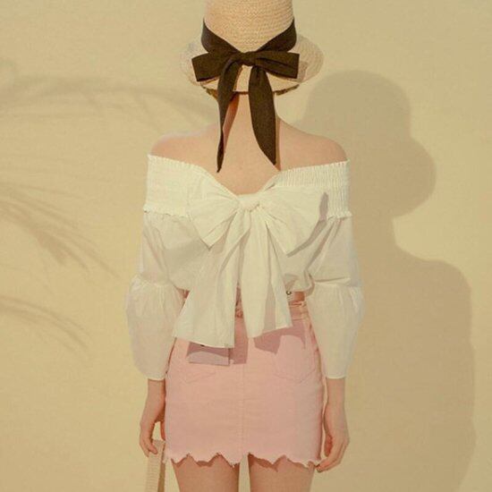 大きなバックリボンが大人かわいいオフショルダーブラウス。