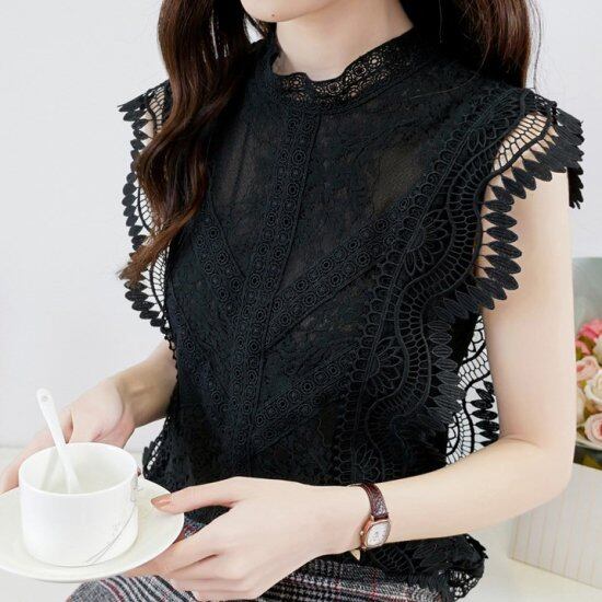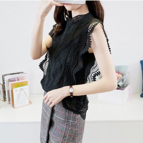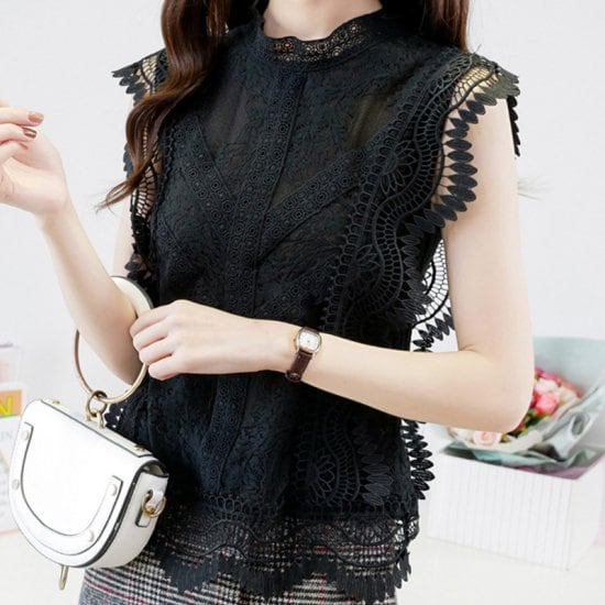 ブラウス シャツ レースブラウス レディース ノースリーブブラウス 総レース 透かしレース スタンドカラー ハイネック 袖なし 黒 ブラック ホワイト レトロ クラシカル きれいめ 上品 おしゃれ
