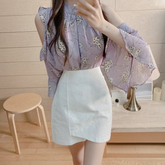 ブラウス フリルブラウス オープンショルダー レディース シャツ プルオーバー 花柄 トランペットスリーブ ボリューム袖 肩出し 肌見せ ハイネック パープル ボタニカル きれいめ おしゃれ デート