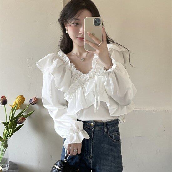 ブラウス シャツ フリル レディース Vネック フリルネック キャンディスリーブ ボリューム袖 オフショルダー プルオーバー 白 ホワイト 肩出し 肌見せ かわいい フェミニン ガーリー おしゃれ