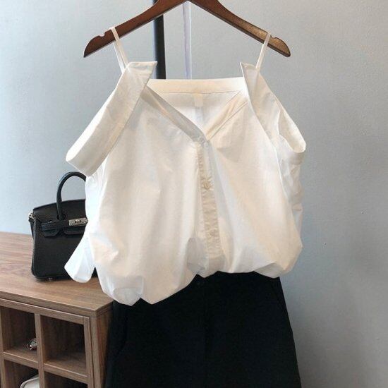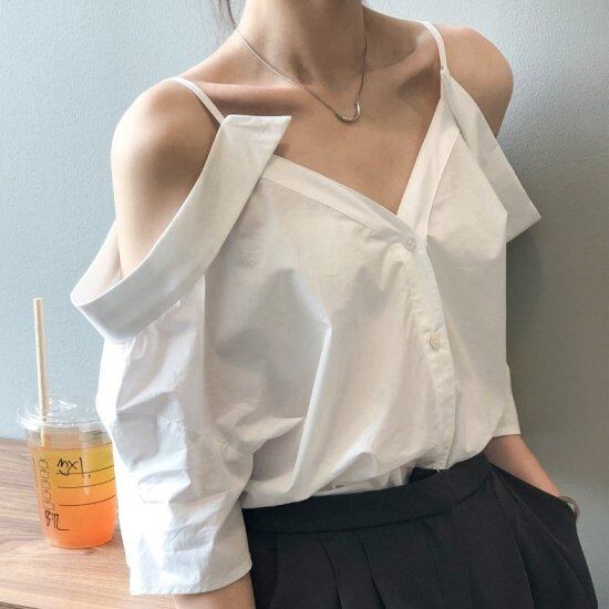 ブラウス シャツ オフショルダー レディース Vネック オフショル 肩出し 肌見せ 半袖 五分袖 白 ホワイト かわいい きれいめ カジュアル セクシー ゆったり 白シャツ スリングシャツ 春夏