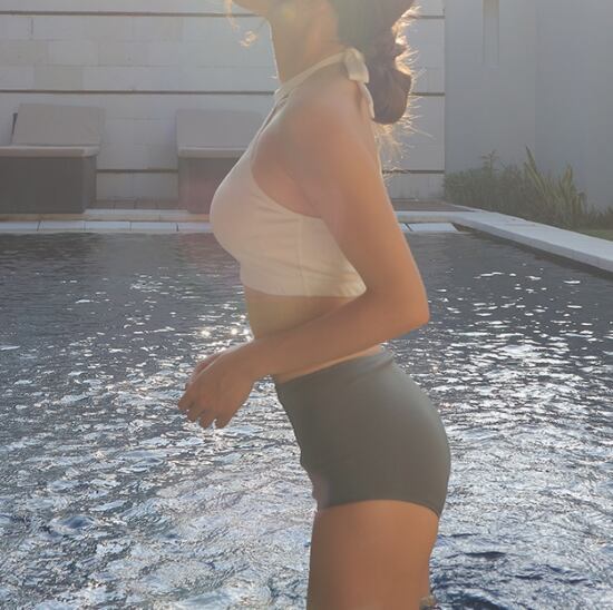 ホルターネックで胸元の露出低めに、ビキニながらお腹をしっかりとカバーできるハイウエストデザイン。