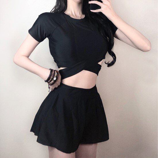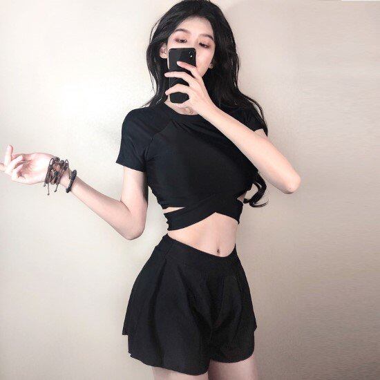 半袖トップス、ショートパンツ、インナーショーツの3点セットビキニ。