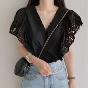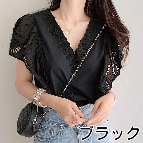 ブラウス レディース ノースリーブ レース フリル Vネック シャツ フレアスリーブ 花柄 シャツブラウス 春夏 夏 フリル袖 白ブラウス 黒ブラウス ノースリーブブラウス フリルブラウス 可愛い