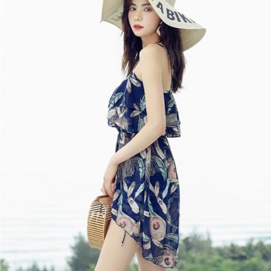 ビキニ レディース 水着 セットアップ ビーチウエア カバーアップ ボクサーパンツ フェザー柄 孔雀 ボヘミアン 濃紺 ネイビー 2way きれいめ 上品 大人 ワンピース リゾート 海 プール 夏