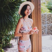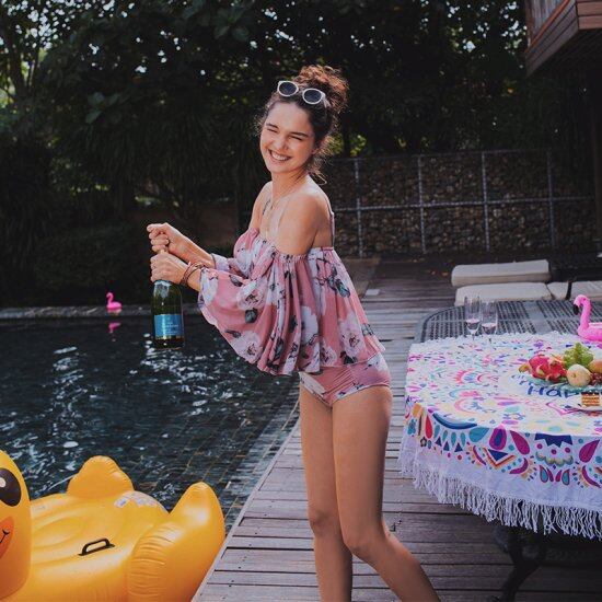 大きめのフラワープリントが華やかなビキニとオフショルダートップスのセットアップ。