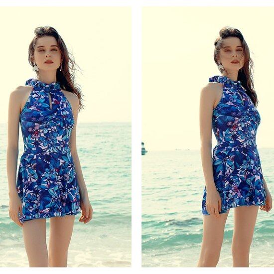 ワンピース水着 レディース 水着 花柄 ホルターネック スカート付き バックリボン フラワープリント ボタニカル ブルー 総柄 かわいい きれいめ 大人 おしゃれ 海 プール リゾート バカンス 夏
