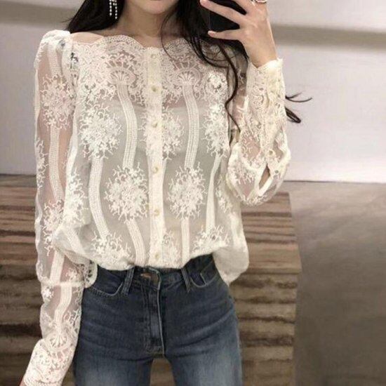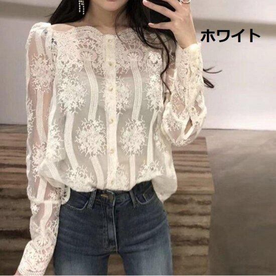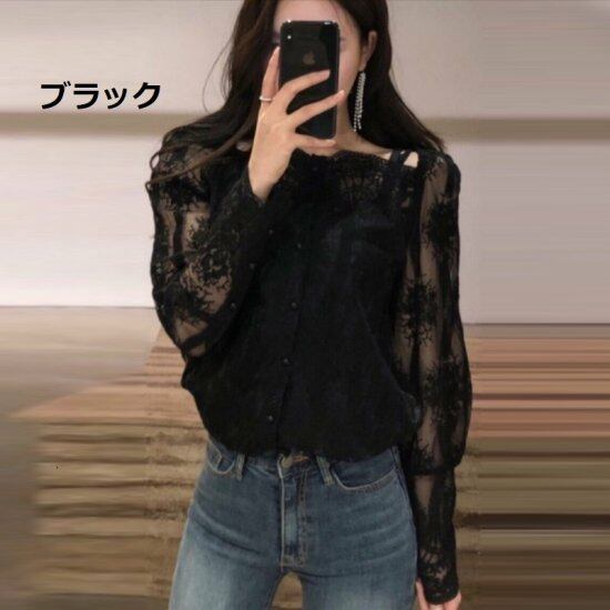 ブラウス レース シースルー レディース シャツ 長袖 レースブラウス 透け感 シアーブラウス 総レース 黒 ブラック ホワイト レトロ クラシカル エレガント きれいめ ガーリー おしゃれ デート
