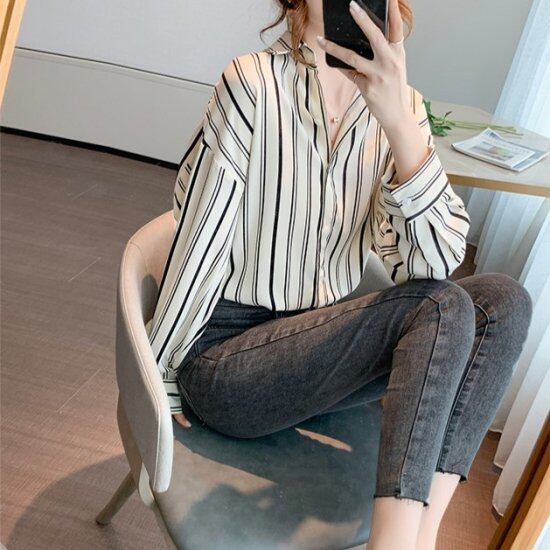 シャツ レディース ブラウス ストライプ 長袖 Vネック シャツカラー ストライプシャツ ゆったり ルーズ プリントシャツ シャープ きれいめ カジュアル おしゃれ オフィスコーデ 長袖ブラウス