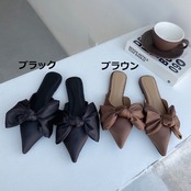 ミュール レディース 靴 シューズ サンダル ポインテッドトゥ リボン ハーフスリッパ フラットシューズ ローヒール ぺたんこ シック ブラック ブラウン 黒 茶 カジュアル きれいめ 履きやすい