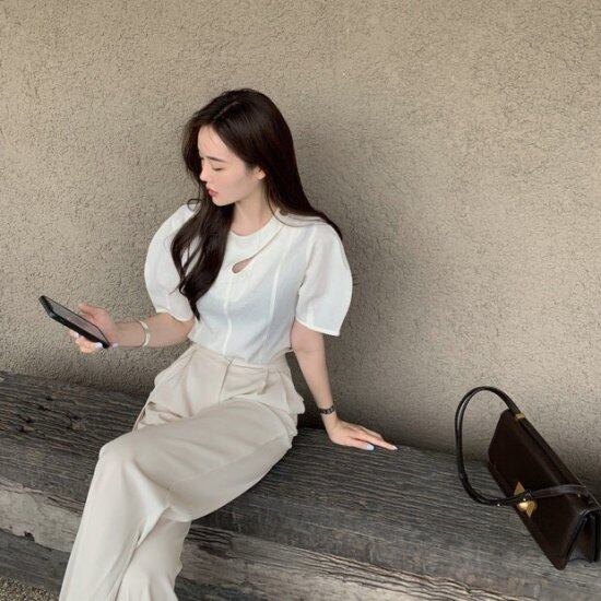 ふんわりとしたパフスリーブが大人かわいい半袖ブラウス。