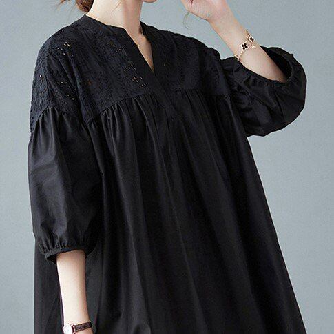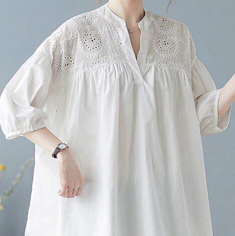ブラウス レディース 七分袖 大きいサイズ チュニック Vネック レース ゆったり 白ブラウス 黒ブラウス チュニックブラウス 春夏 春 夏 ドロップショルダー 刺繍 シャツブラウス 刺繍ブラウス