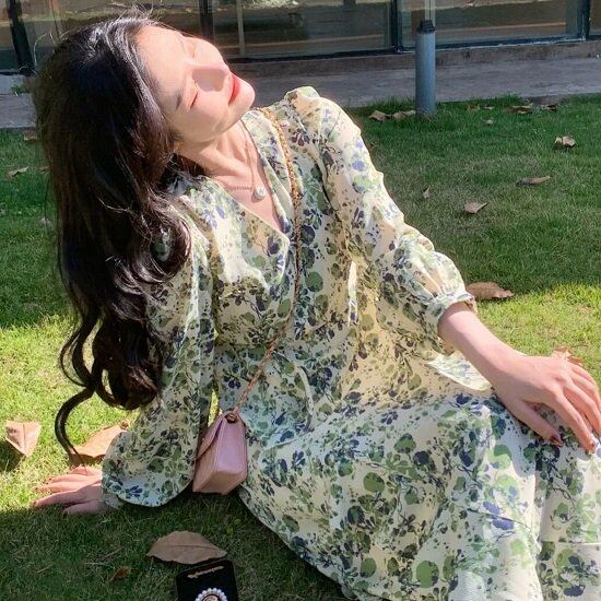 花柄ワンピース 長袖ワンピ ミモレ丈 ワンピース 春 柄 Vネック パフスリーブ ボリューム袖 ウエスト切り替え ひざ丈ワンピ 花柄ワンピ 長袖 大きいサイズ 花柄ワンピース 長袖ワンピ ミモレ丈