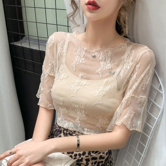 ブラウス レディース シャツ レース プルオーバー シースルー シアープルオーバー 透け感 半袖 五分袖 フレアスリーブ 襟なし レトロ かわいい きれいめ ガーリー おしゃれ パーティー リゾート