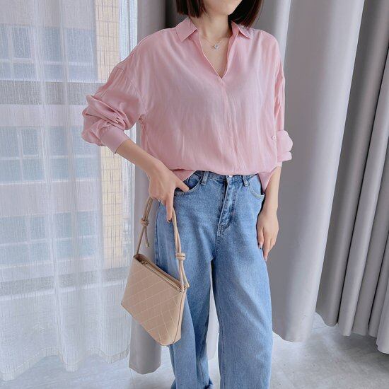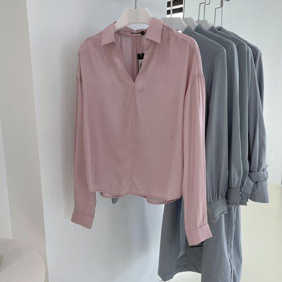 シャツ レディース ブラウス アシンメトリー スキッパー Vネック プルオーバー キーネック 長袖 ゆったり ピンク サイドボタン デザインシャツ レトロ かわいい カジュアル 2way おしゃれ