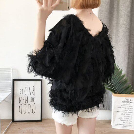 ブラウス レディース シャツ プルオーバー フェザー Vネック 半袖 七分袖 ゆったり 黒 ブラック ホワイト シック モード かわいい きれいめ ガーリー カジュアル 体型カバー おでかけ デート
