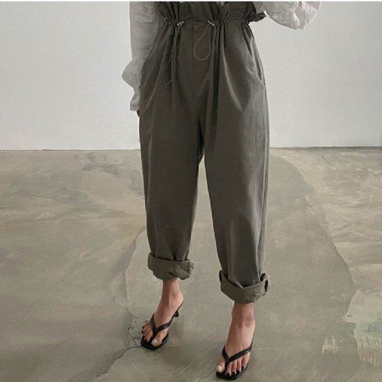 ワイドパンツ レディース パンツ ハイウエスト シャーリング ウエストマーク リボン ひも ボリューム ストリート コットン 黒 ブラック かわいい カジュアル ガーリー おしゃれ 体型カバー
